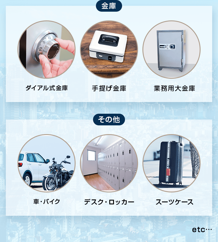 鍵の紛失、暗証番号忘れ、ダイヤル不具合などによる金庫の開錠に対応。家庭用金庫から業務用耐火金庫まで、幅広い種類の金庫を開錠可能です。内容物を傷つけず、可能な限り非破壊での開錠を心がけています。