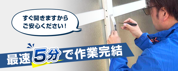 鍵の種類や状況にもよりますが、5分~15分程度あればほとんどの鍵の解錠が可能です。